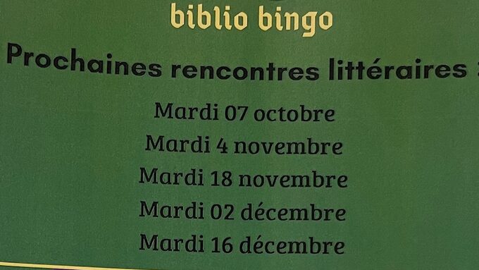 Par EMILIE CHARLET, publié le mercredi 24 septembre 2025 11:50 - Mis à jour le mercredi 24 septembre 2025 11:51Voici les dates prévues pour les prochaines rencontres littéraires des mardis pour le Biblio bingo et son Club lecture, dates jusqu’aux vacances de noël. -