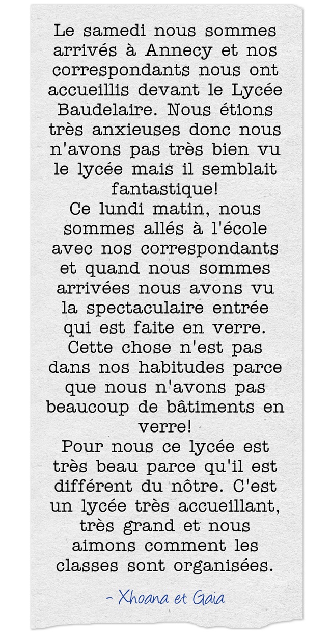 Après un week-end passé en famille, les élèves ont découvert le lycée Charles Baudelaire lundi 12 mars. Au programme de la journée: immersion dans les classes de Seconde et Première du lycée et découverte du système scolaire français.